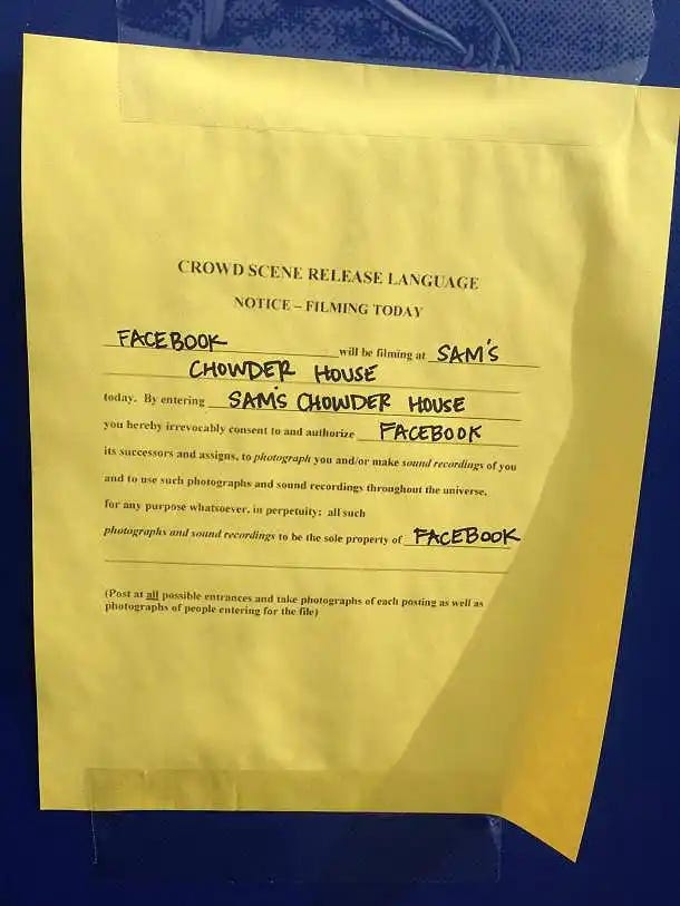 On June 1, 2013, a lovely warm day in the San Francisco area, Matyszczyk and a friend went to Sam’s Chowder House on Half Moon Bay to grab a bite. As he headed inside, he saw a notice taped to the front door of the restaurant, one undoubtedly ignored or unseen by many of the hundreds of patrons. In the fine print, it declared that by simply entering Sam’s, you’d given Facebook the rights to put you under photographic and audio surveillance while inside (regardless of whether you agreed with, or even read the notice). Furthermore, Facebook claimed it could “use such photographs and sound recordings throughout the universe, for any purpose whatsoever, in perpetuity, and all such photographs and sound recordings [would] be the sole property of Facebook.”