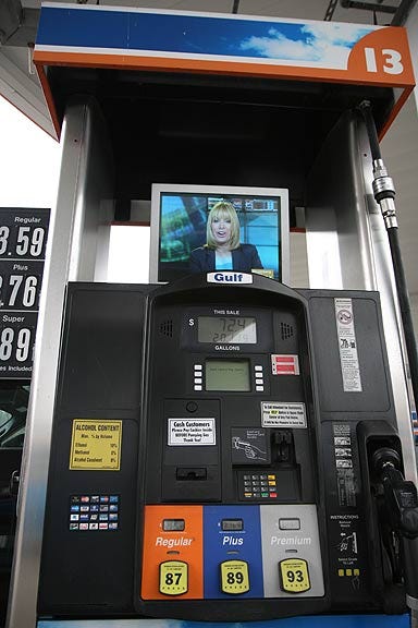 That’s what I thought anyway, until I pulled into the Natick rest stop on the Massachusetts Turnpike. Where one once heard the quiet whirring of mechanical readouts or the hushed whoosh of fuel flowing through a hose, there was now the high-decibel carny-barking of one of those over-produced sports shows, where football players wear ties and logos make noise. In short, there was a TV on my gas pump.
